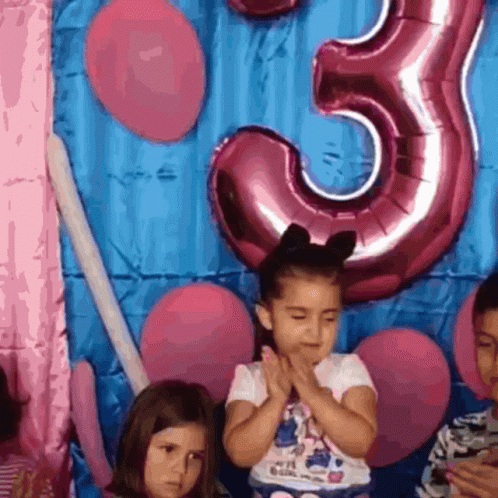 A cheerful little girl with bunny ears claps happily in front of pink and blue balloons at a celebration.