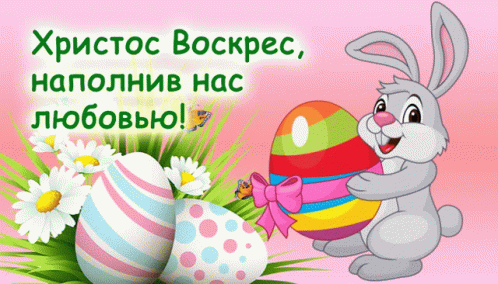 An Easter greeting with a bunny and eggs transitions to a stark message about war, contrasting love with conflict.