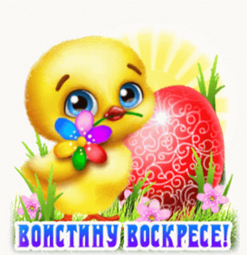 A cute yellow chick with a flower next to a red Easter egg, with Russian greetings 'Happy Easter!' and 'Truly Risen!'.
