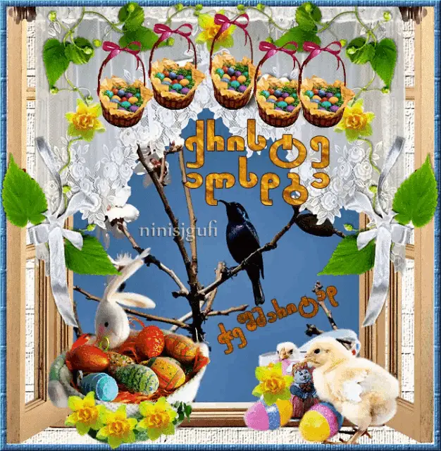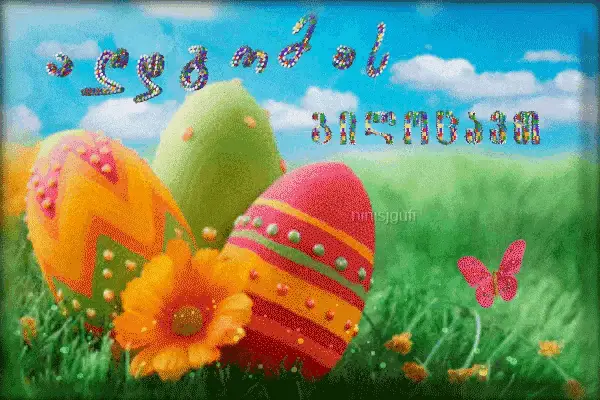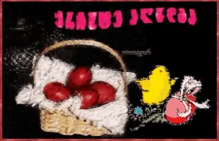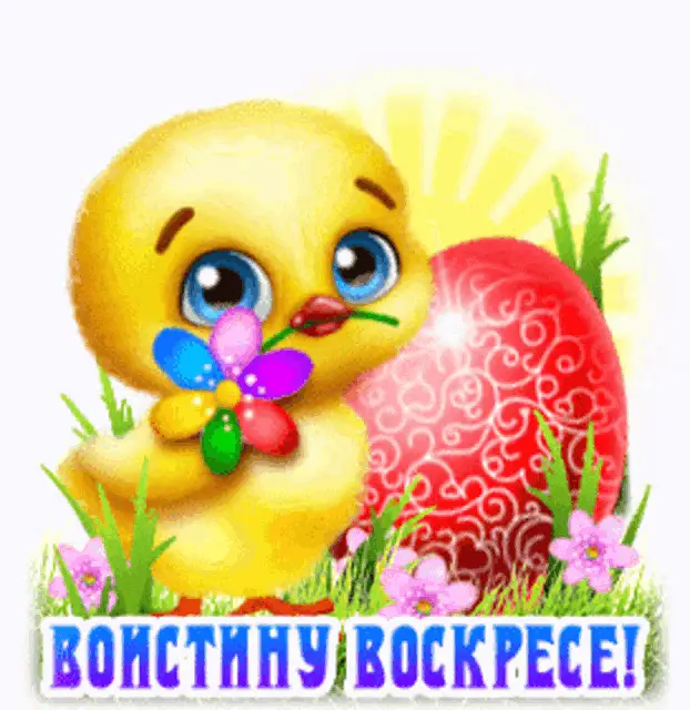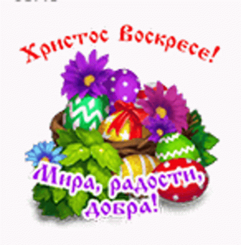 Animated Easter greeting with colorful eggs in a basket, flowers, and the message 'Christ is Risen! Peace, joy, goodness!'