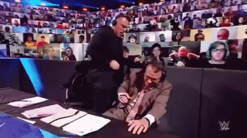 Pat McAfee stands over Michael Cole at the WWE commentary desk during Smackdown, with virtual fans in the background.