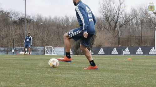 An Argentina national football team player practices kicking a soccer ball on a field.