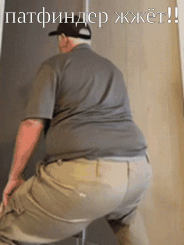 A man, referred to as Pathfinder, performs a funny dance move, bending over with humor.