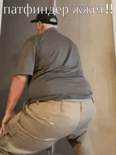 An overweight man, referred to as Pathfinder, enthusiastically dances or twerks in a grey shirt and khaki pants.