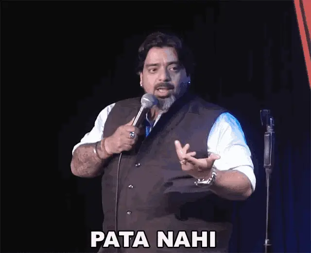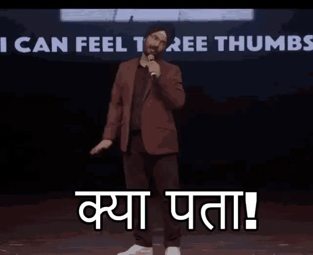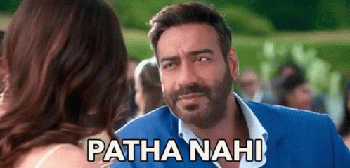 Ajay Devgn in a blue suit, talking to a woman with 'Patha Nahi' (I don't know) text overlay.