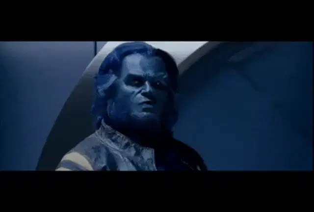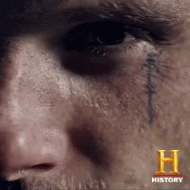 A close-up of a man's face, possibly Floki or Bjorn from Vikings, with a tear tattoo, looking nervous.