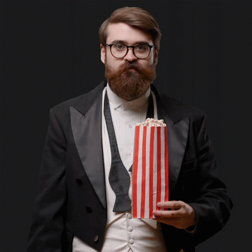 A man in a tuxedo and glasses eats popcorn from a striped bag, reacting with surprise and amusement.