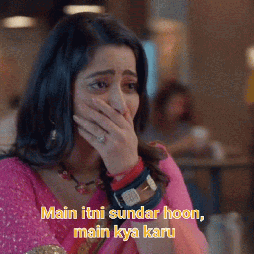 Patralekha from Ghkkpm, wearing a pink saree, covers her mouth while saying 'Main itni sundar hoon, main kya karu'.