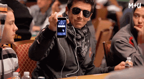 Patrick Bruel, wearing sunglasses, holds up his smartphone displaying 'CASH' at a poker table.