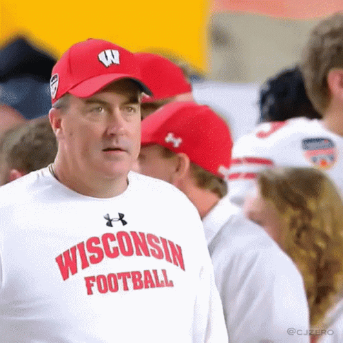 Paul Chryst, wearing Wisconsin Football gear, reacts with surprise and disbelief to a turnover during a game.