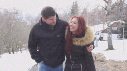 Paula Shy and her boyfriend happily walking together in a snowy winter landscape.