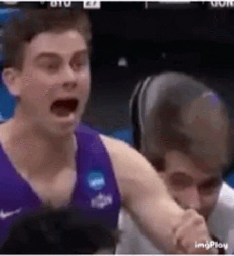 Paulhiepler's intense screaming reaction during an ACU game, wearing a purple tank top.
