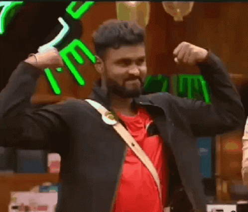 Pavmir Amir Ads confidently flexes his biceps, showcasing his strength with a smile.