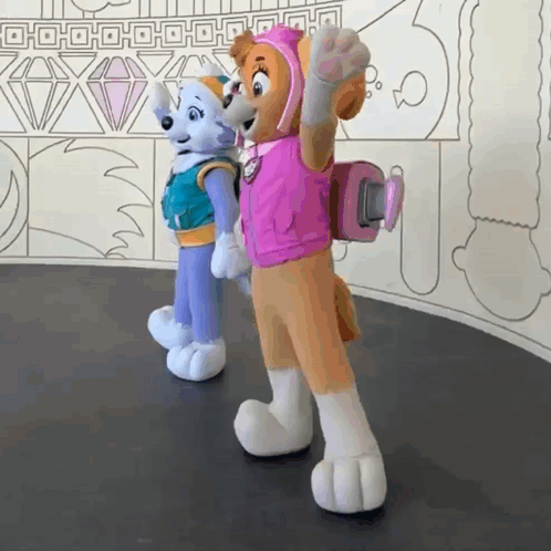 Skye and Everest from Paw Patrol in mascot costumes pose and rotate on a stage, bringing joy to fans.