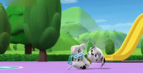 Paw Patrol's Skye helps Marshall by untying his legs, leading to a playful tumble in the park.