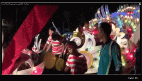 A vibrant night parade in Madura, Indonesia, showcasing traditional Tongtong music and illuminated floats during a festival.
