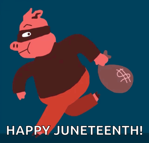 A cartoon pig, wearing a mask, runs with a bag of money, with the text "Happy Juneteenth!" displayed.