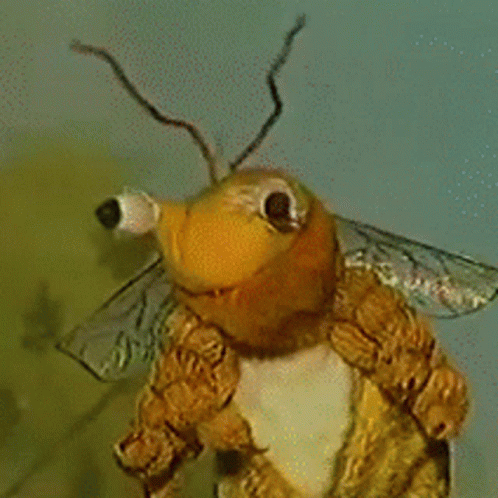 Funny bee puppet with wide open mouth and heart-shaped tongue, making a silly expression.