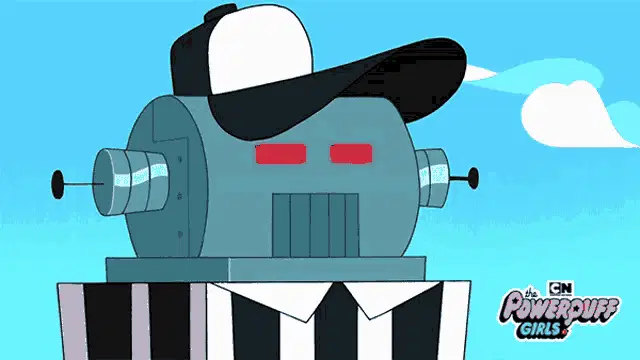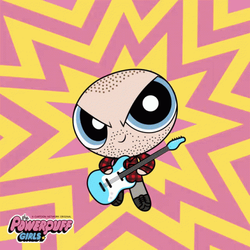 A Powerpuff Girls-style character, bald with stubble, holding a light blue electric guitar.