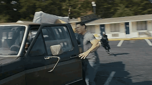 a man in a grey shirt is standing next to a black truck
