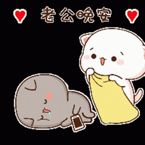 Peachcat gently covers a sleepy cat with a yellow blanket, conveying a sweet 'Good night, husband' message.