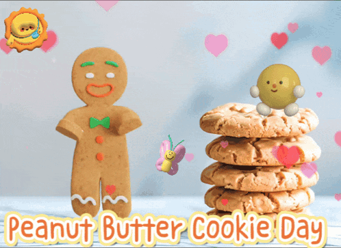 A cheerful gingerbread man celebrates Peanut Butter Cookie Day with a stack of delicious cookies.