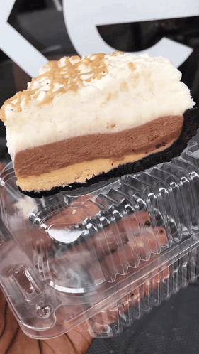 A delicious slice of layered peanut butter pie with chocolate and whipped topping in a clear container.