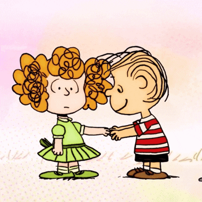 Linus Van Pelt sweetly kisses Frieda's hand in a charming Peanuts moment.