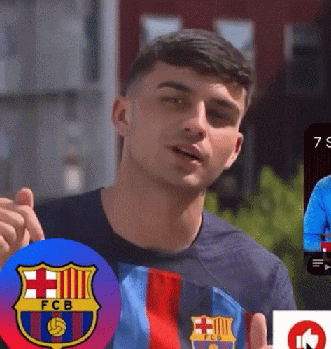 Pedri Gonzales, the FC Barcelona midfielder, waves to the camera while wearing his team's jersey.