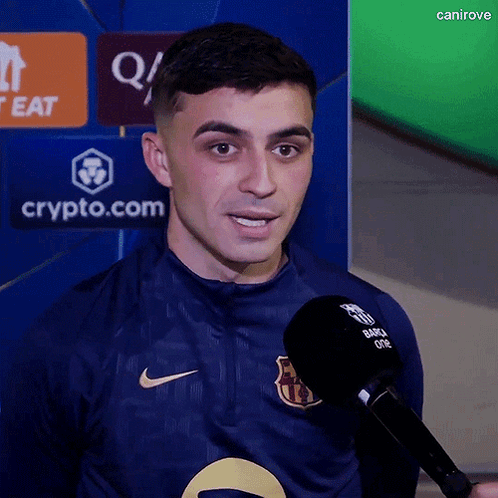 FC Barcelona star Pedri Gonzalez speaks into a microphone, wearing his team's Nike training shirt.
