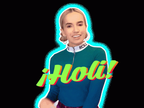 Pedrina waves and smiles, greeting viewers with '¡Holi!' while wearing a stylish green sweater.