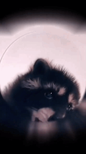 Adorable Pedro the raccoon wearing a cone, being gently held and spun around.
