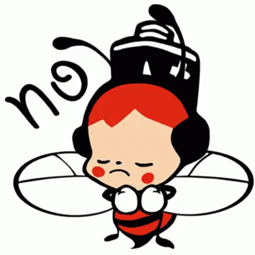 Peebeez Beezyourphoone, a cartoon bee with a battery, shakes its head 'no' emphatically.