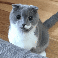 A cute gray and white cat with big eyes plays peek-a-boo from behind a couch.