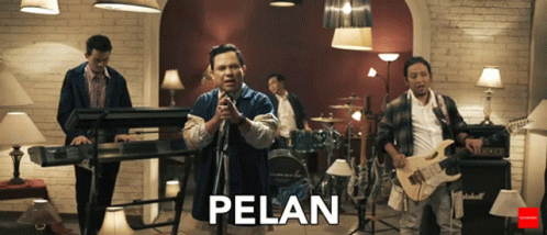 Wali Band performs their song 'Pelan Tenang' in a music video, with the lead singer at the microphone.