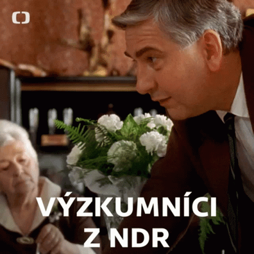 A scene from the Czech film Pelisky, featuring a man in a suit looking at flowers, with the text "Researchers from GDR" overlaid.