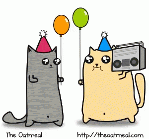 Two cartoon cats in party hats, holding balloons and a boombox, from The Oatmeal.