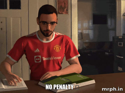 Bruno Fernandes in Manchester United jersey reacts to 'No Penalty' decision on a book.