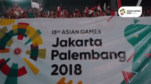 Indonesian supporters cheer at the 18th Asian Games in Jakarta Palembang 2018, with a large banner.