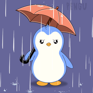 Pengu Pudgy, a cute penguin, stands sadly in the rain holding an umbrella, looking a bit mad or upset.