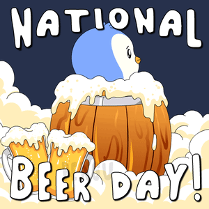 Pengu Pudgy celebrates National Beer Day, emerging from a beer barrel with two full mugs of foamy beer.