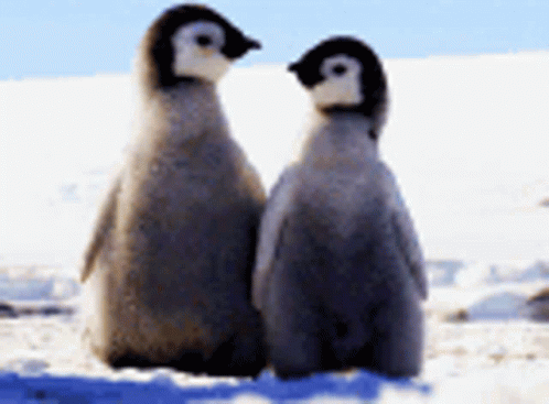 Two adorable baby penguins stand close, shaking their heads in a cute and confused manner.