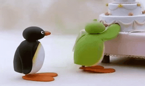 A mischievous green penguin secretly takes a piece of cake from a tiered cake, observed by another penguin.