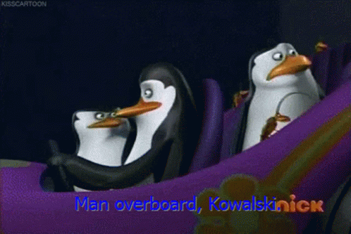 Skipper, Kowalski, and Private from The Penguins of Madagascar are in a purple car, with the caption 'Man overboard, KowalskiNick'.