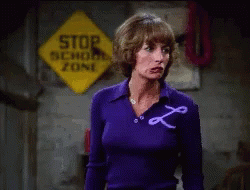 Penny Marshall as Laverne DeFazio from Laverne & Shirley, looking serious in a purple shirt with an 'L' emblem.
