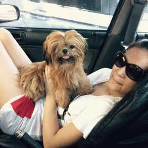 Penpen Daphane Mara Canteros relaxing in a car with her adorable Shih Tzu dog, Penpen, who has its tongue out.