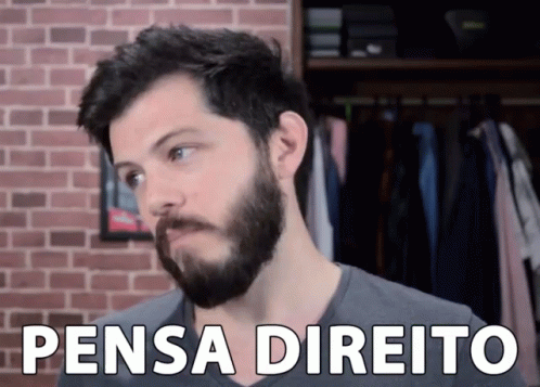 A man with a beard stands in front of a brick wall with the text 'Pensa Direito' (Think Straight) overlaid.