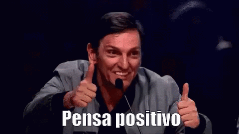 Man gives two thumbs up and smiles, encouraging viewers with the text 'Pensa positivo' (Think positive).