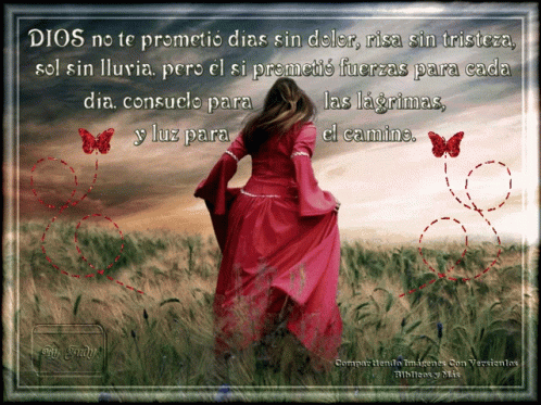 A woman in a red dress walks through a field, accompanied by an inspiring Christian quote in Spanish.