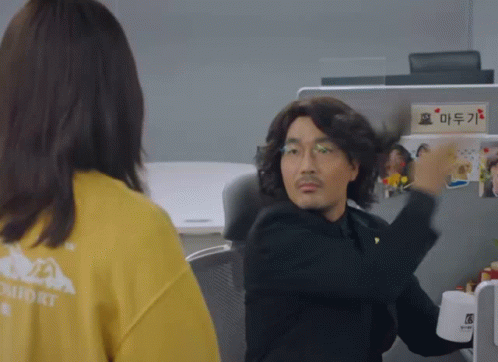 A man in a wig, glasses, and fake mustache stands in an office, interacting with a coworker.